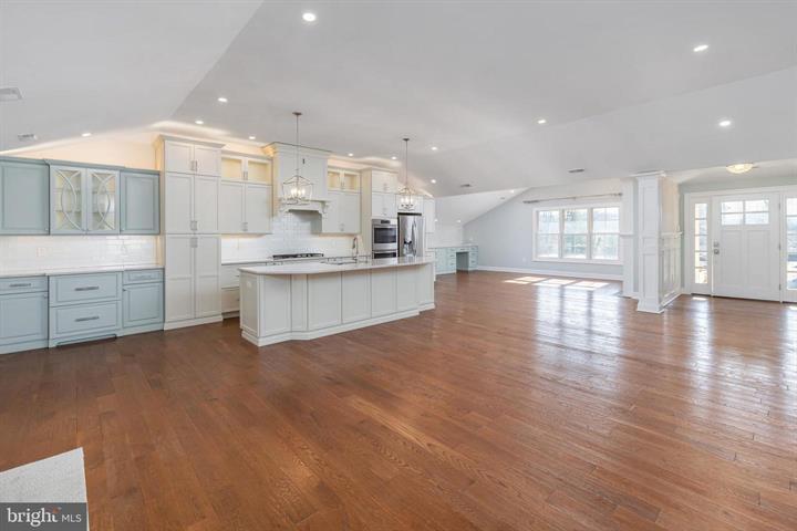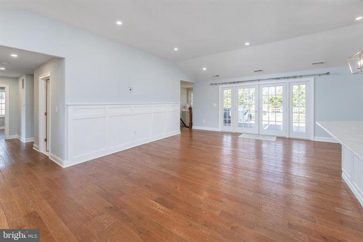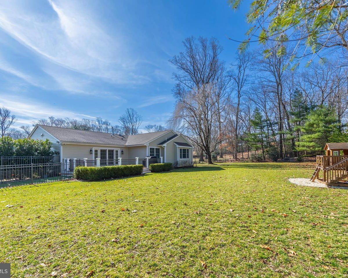 Beautiful custom rancher with 4 bedrooms, 2 1/2 bathrooms on almost an acre of professional landscaped grounds located on a very private street that was totally redone 7 years ago with a finished basement and a large 2 car garage with a big driveway and a beautiful patio overlooking a very private backyard. There are hardwood floors throughout the 1st floor. The floor plan gives you a very open feeling throughout the home. The large family room has a gas fireplace, built-in-wine refrigerator with granite counters. The large kitchen/ dining room has granite counters, stainless steel appliances, 5 burner cooktop, double wall ovens, tile backsplash, light fixtures along with access to backyard deck. It has large primary bedroom that has high ceilings with large walk-in closet, the primary bathroom has double sink vanity with granite tops, tile floor and large tiled shower. The hall bathroom has granite counters and tiled floor with tiled shower /tub combo and a linen closet. The other 3 bedrooms have hardwood floors, recess lights, and painted in neutral colors. There is a full finish basement with vinyl floors, recess lights, separate crawl space, elevator and a large laundry with sink and cabinetry. Access to the large 2 car garage is through the basement. This home has been redone from top to bottom and is in pristine condition with an open floor plan.